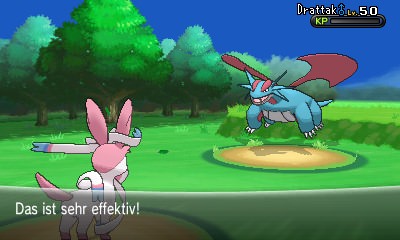 Die Charaktermodelle sind zwar weiterhin nur plastisch wirkende Sprites, doch die Kampfanimationen wissen sehr zu gefallen. Im Gefecht wurde der 3D-Effekt implementiert, allerdings läuft er nicht sehr flüssig. Stellenweise hat man das Gefühl nur zehn Bilder pro Sekunde zu sehen, was sehr anstrengend für das Auge werden kann. Glücklicherweise kann man den Tiefeneffekt aber auch ausstellen. Wenn man im 2D-Modus spielt sieht man allerhand sehr schön animierte Pokémon, samt eigens entwickelten Animationen, welche dank ihrer ansprechenden Umsetzung, die Kämpfe zu einer der Highlights des Spiels machen.