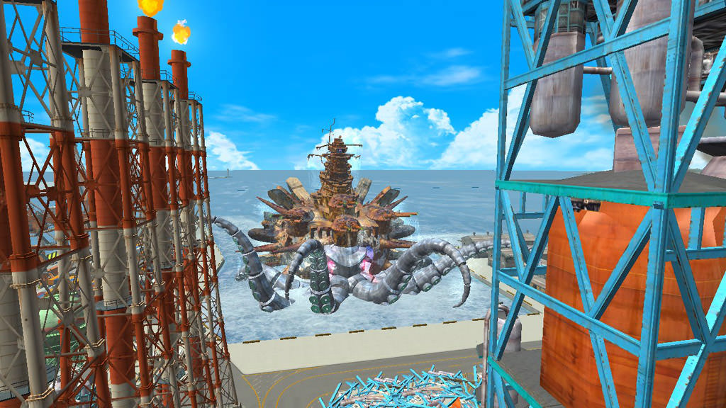 Klingt soweit ganz gut? Richtig. Ist es aber nicht. Tank! Tank! Tank! ist derart simpel, dass man sich ernsthaft fragt, warum das Spiel so schlecht umgesetzt werden konnte. Dabei ist es nicht nur die Technik aus der Steinzeit, die euch die Tränen in die Augen treibt. Selbst auf Segas Dreamcast waren grelle Farben und texturarme Flächen schon schöner zu sehen gewesen. Die aus dem Boden poppenden Feinde, die selbst in den kleinen Arealen ruckelnde Engine und die karg eingerichteten Locations tragen alle ihren Teil dazu bei, dass man sich einfach noch einmal die Hülle zur Hand nehmen und prüfen muss, ob man es hier wirklich mit einem Titel auf einer aktuellen HD-Konsole zu tun hat. Der japanisch-trashige Artstyle und der dudelnde Sound hätten sogar noch zum irren Spielprinzip gepasst und auch die komplette deutsche Synchronisation soll erwähnt werden. Allerdings wiederholen sich die einzelnen Kommentare hier so oft, dass sie euch schnell auf den Zeiger gehen werden.