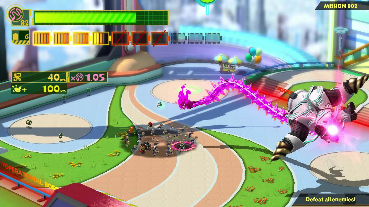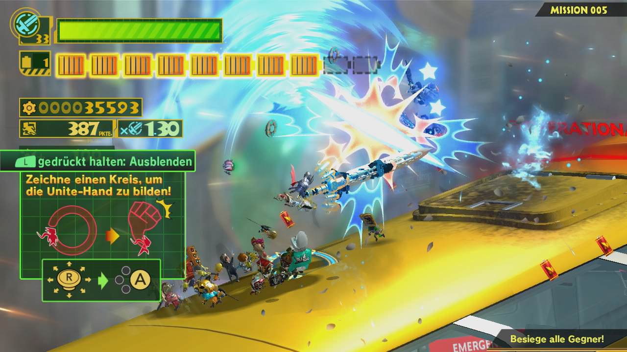 In vorgegebenen Arealen müsst ihr die feindlichen Eindringlinge beseitigen, um in der Geschichte voranschreiten zu können. Dabei dürft ihr nicht nur kleine Roboter aus dem Weg räumen, sondern bekommt es schon bald mit riesigen Blechgenossen, großen Panzern und metallischen Skorpionen zu tun. Nicht nur diese solltet ihr zerstören, sondern auch einen Blick auf eure Umgebung haben. Demolierte Objekte hinterlassen mitunter Münzen, die ihr im Shop des Spiels eintauschen könnt. Dort holt ihr euch nach jedem Level neue Moves und Fähigkeiten oder Extras, mit denen ihr beispielsweise eure Energie wieder regenerieren könnt. Neigt sich während eines Levels eure Energieanzeige dem Ende, könnt ihr an einem der großzügig gesetzten Rücksetzpunkt beliebig oft neu starten. Allerdings wirkt sich jedes Ableben und jeder Treffer negativ auf eure Bewertung am Ende eines Levels aus. Perfektionisten bekommen somit einen Ansporn, die Levels möglichst optimal abzuschließen. Im Laufe eures Abenteuers sammelt ihr immer neue Helden ein, die nicht nur eure Macht vergrößern, sondern euch auch neue Fähigkeiten verleihen. Wer gerne mit seinen Freunden antritt, darf sich bis zu vier Kumpels vor die Konsole holen und in einem speziellen Multiplayer-Modus in mehreren Wellen Feinde vernichten und dabei möglichst viele Punkte erzielen.